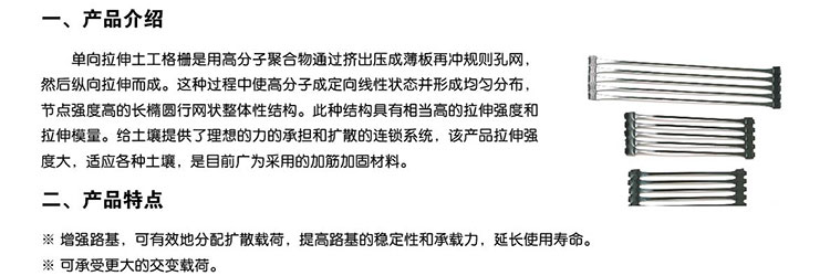 單向拉伸的土工格柵是由高分子聚合物經(jīng)擠出壓成薄板再?zèng)_規(guī)則孔網(wǎng),然后縱向拉伸而成。這種過程中使高分子成定向線性狀態(tài)并形成分布均勻、節(jié)點(diǎn)強(qiáng)度高的長(zhǎng) 橢圓形網(wǎng)狀整體性結(jié)構(gòu)。此種結(jié)構(gòu)具有相當(dāng)高的拉伸強(qiáng)度和拉伸模量,特別是我公司此類產(chǎn)品更具有超國(guó)際水平的高早期(伸長(zhǎng)率在2%—5%)拉伸強(qiáng)度和拉伸模 量。給土壤提供了理想的力的承擔(dān)和擴(kuò)散的連鎖系統(tǒng)。該產(chǎn)品拉伸強(qiáng)度大(>150Mpa),適應(yīng)各種土壤,是目前廣為采用的加筋加固材料。